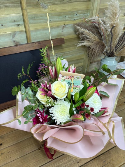 Beautiful hand tied bouquet with seasonal blooms created with love by our expert florist using double wrap and luxury ribbon( please note this is a sample of a large hand tied bouquet )